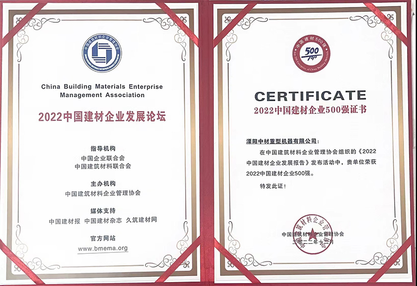 - Сертификат 500 лучших китайских строительных предприятий 2022 года